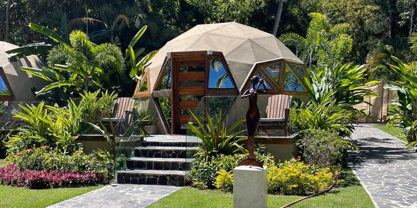 Santuario is located right on the river that connects to the sea. The picture is of Santuario’s unique Geodomes with King size beds, and a luxurious shower and tub.